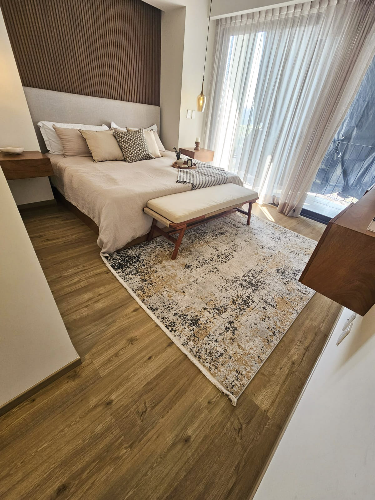 La calidez del SPC color Encino y la profundidad del lambrín Tabaco elevan tu habitación a un nivel de diseño superior. Ideal para crear ambientes modernos, confortables y llenos de estilo.